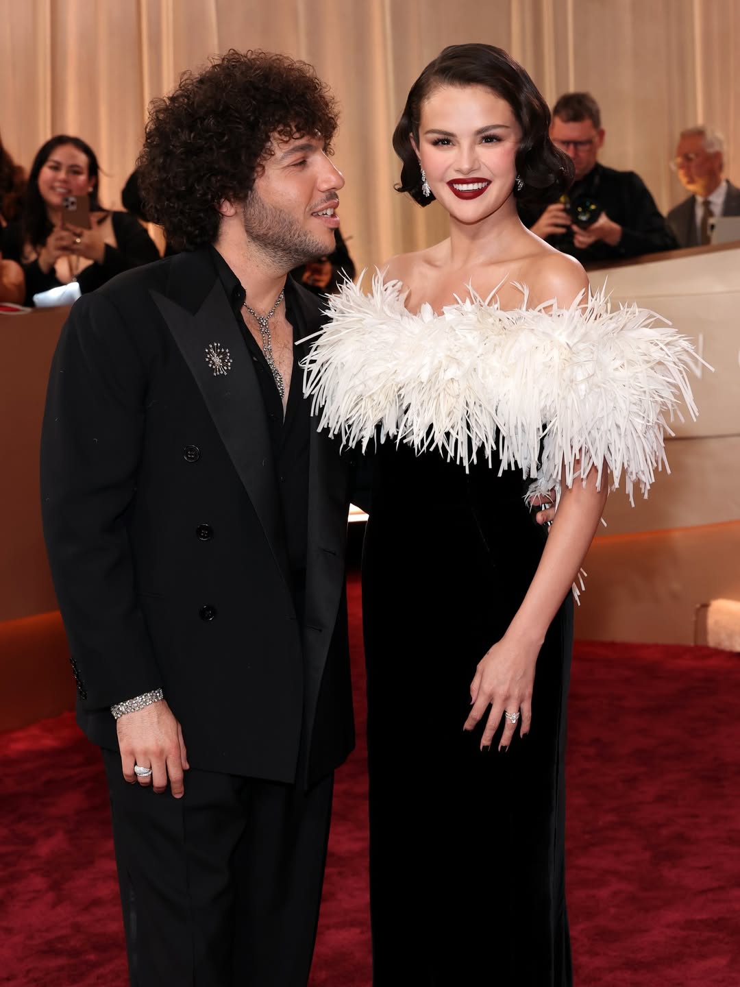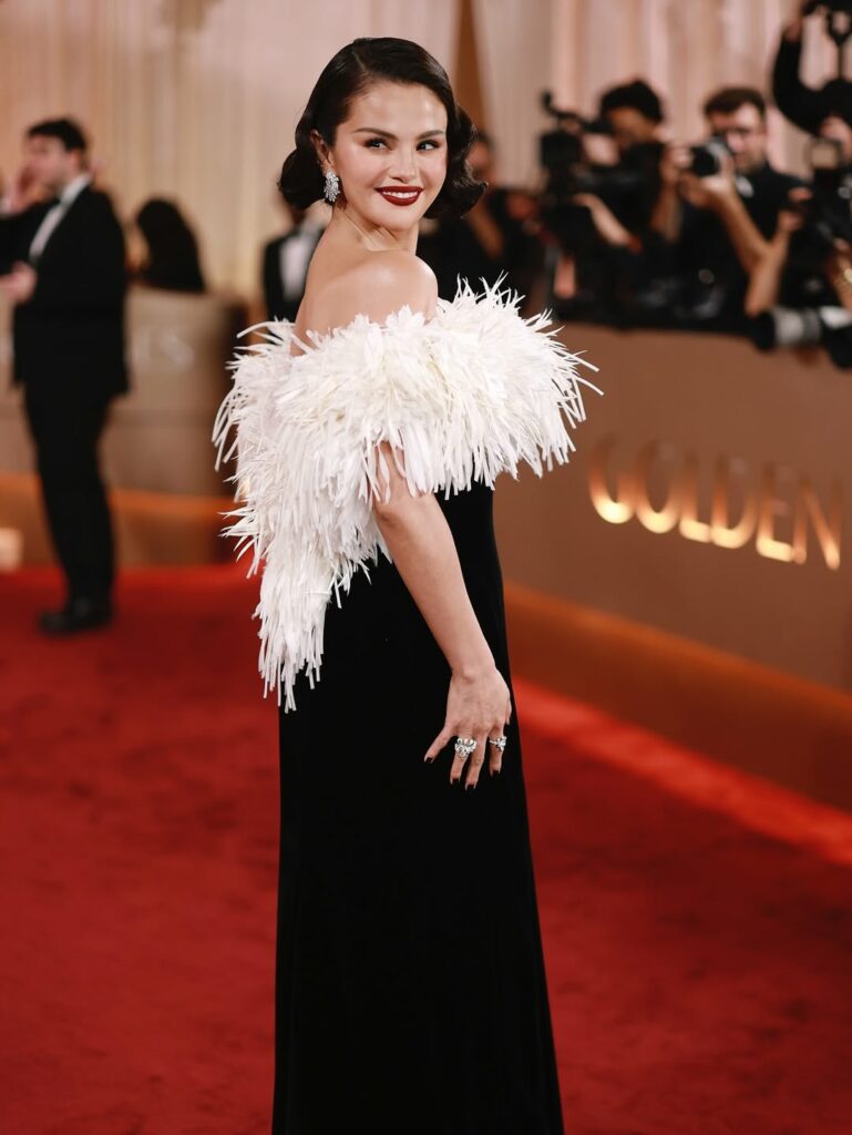 Selena apostó por un vestido con plumas blancas en la parte superior, de Chanel, que tomó treinta treinta y dos horas de confección, complementado con un labial rojo, que nunca pasa desapercibido.