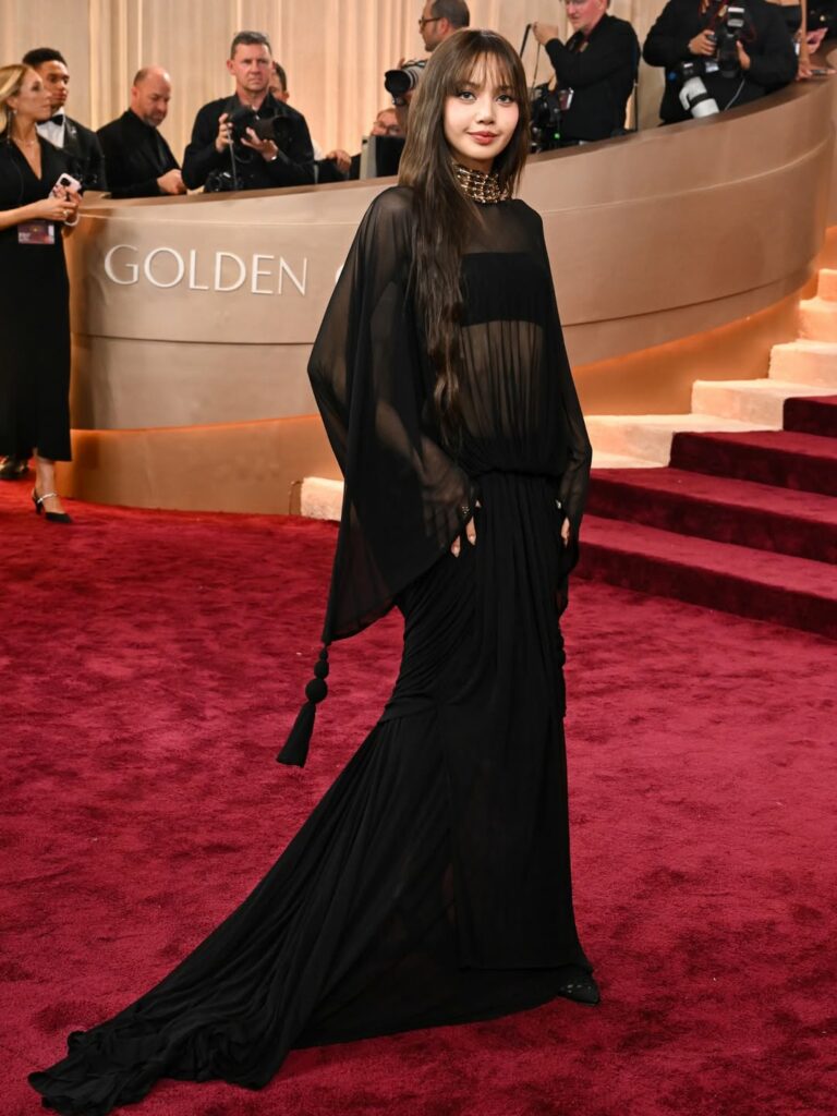 Miembro del grupo coreano BLACKPINK, Lisa lució en la alfombra roja con un vestido negro de Jacquemus que combinó transparencias con una falda ceñida y una capa con transparencia. Completó el look con un collar chunky que elevó el look.