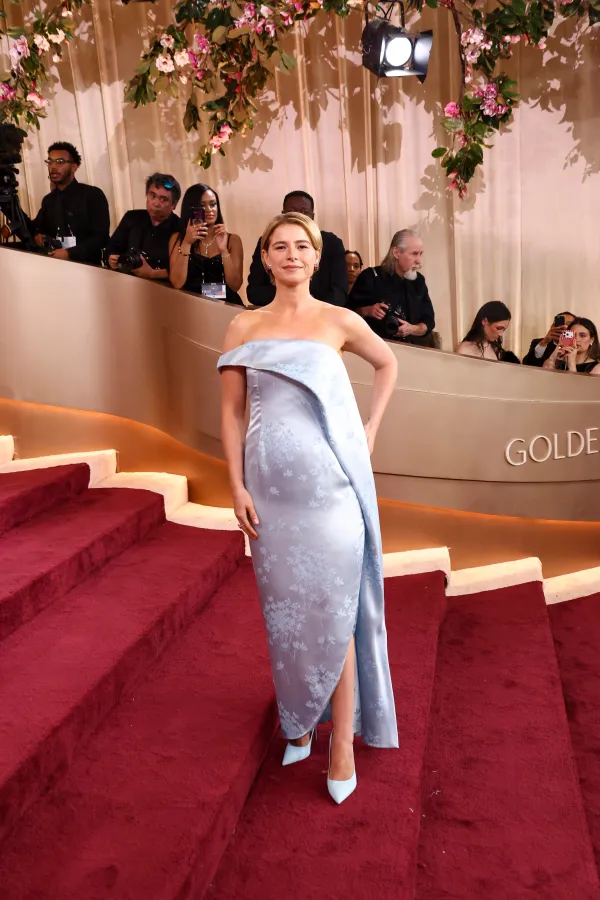 Ganadora como Mejor Actriz de Drama por su actuación en ‘Hamnet’, Jessie Buckley apostó por un vestido baby blue de Dior, luciendo radiante con su hermoso embarazo.
