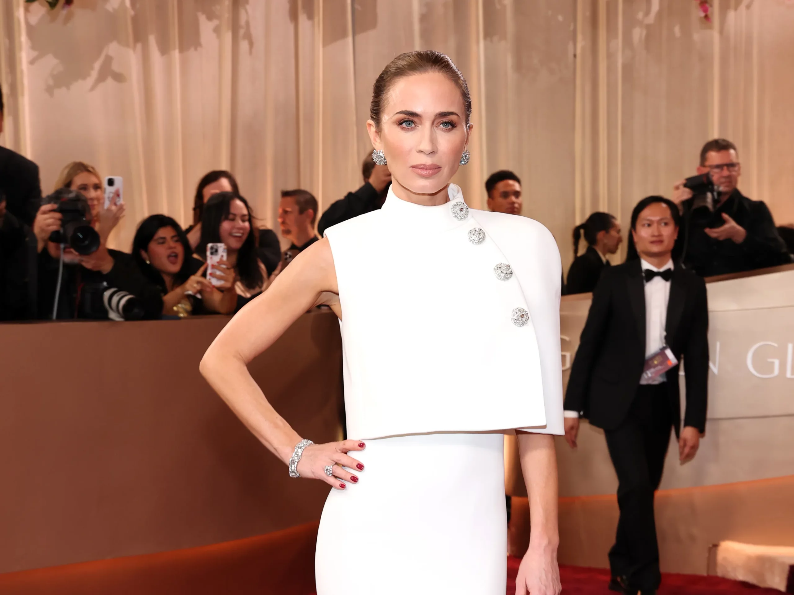 Emily Blunt, nominada a Mejor Actriz de Reparto y Mejor Película por su interpretación de Dawn Staples en The Smashing Machine, apostó por un total look blanco de Louis Vuitton, realzado con botones de diamante.