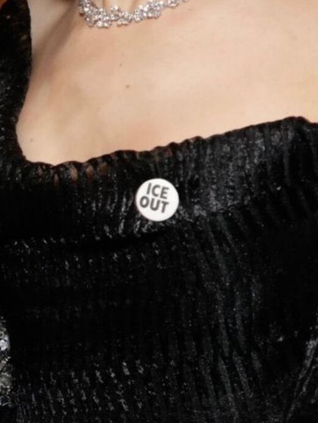 Nominada por su interpretación en Wicked, Ariana lució un vestido corte princesa (como ella) de Vivienne Westwood, luciendo increíble. Sumándose como gesto de apoyo y conciencia social, no dudó en usar un pin anti-ICE.