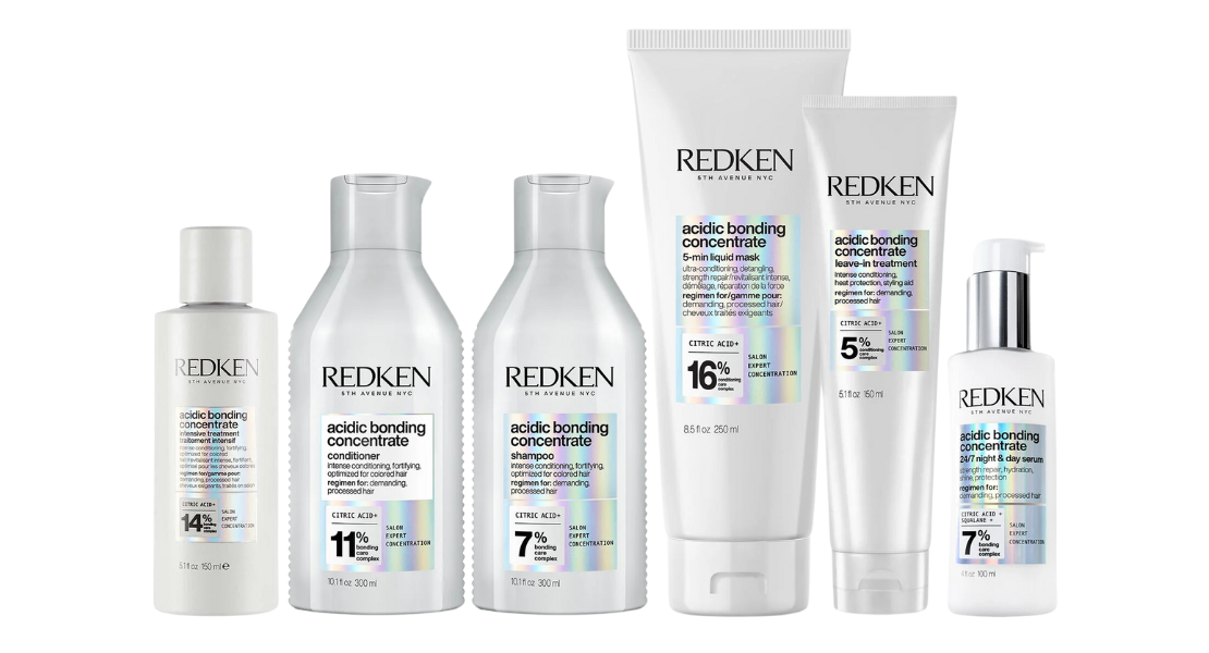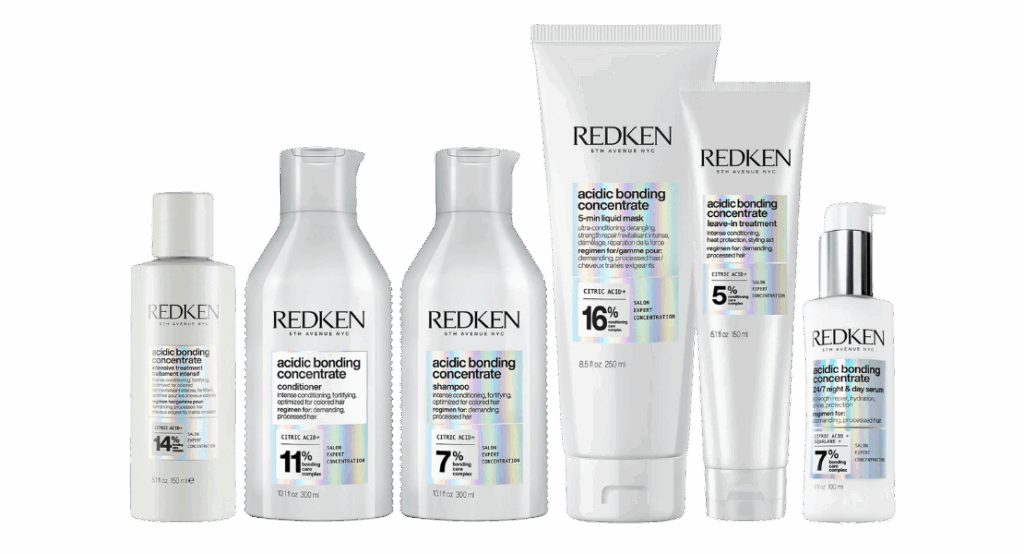 - Redken Acidic Bonding: fórmula con ácido cítrico y un pH ácido para restaurar enlaces, ideal tras procedimientos químicos.